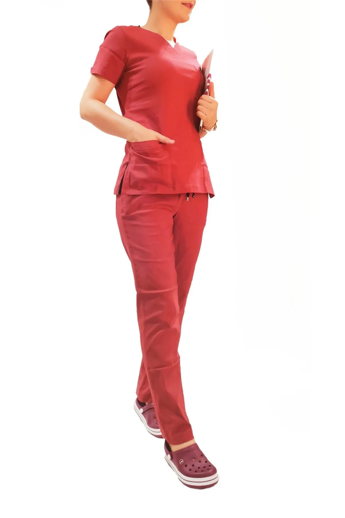 Likralı Terikoton V-Yaka Takım Kırmızı Doktor,Hemşire,Estetisyen,Güzellik,Eczacı,Labaratuvar